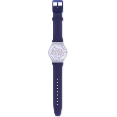 This Swatch watch strap is made of silicone and is attached to the watch by means of steel pins. The band has a width of 19.7 mm and is closed by means of a buckle. The strap has no straight mount which means that this strap is only suitable for the watches listed below.
