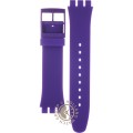 This Swatch watch strap is made of silicone and is attached to the watch by means of steel pins. The band has a width of 19.7 mm and is closed by means of a buckle. The strap has no straight mount which means that this strap is only suitable for the watches listed below.