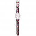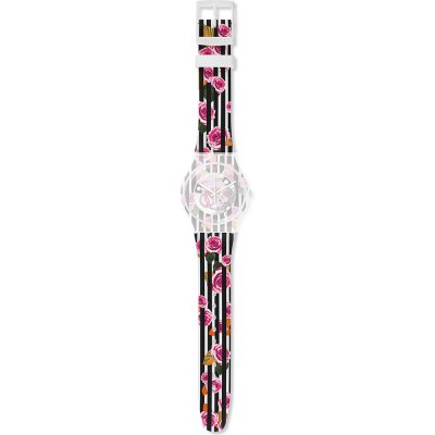 This Swatch watch strap is made of silicone and is attached to the watch by means of steel pins. The band has a width of 19.7 mm and is closed by means of a buckle. The strap has no straight mount which means that this strap is only suitable for the watches listed below.