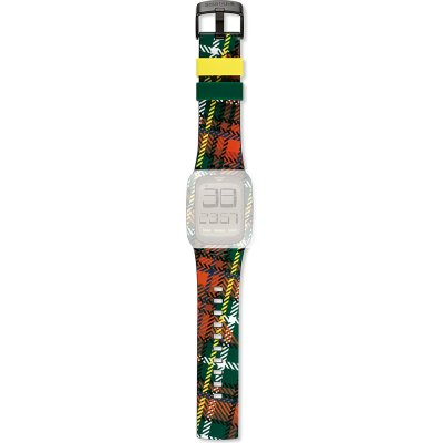This Swatch watch strap is made of silicone and is attached to the watch by means of steel pins. The band has a width of 28 mm and is closed by means of a buckle. The strap has no straight mount which means that this strap is only suitable for the watches listed below.