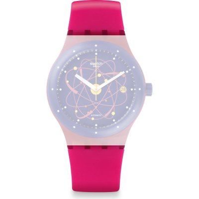 This Swatch watch strap is made of silicone and is attached to the watch by means of steel pins. The band has a width of 19.8 mm and is closed by means of a buckle. The strap has no straight mount which means that this strap is only suitable for the watches listed below.