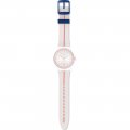 This Swatch watch strap is made of silicone and is attached to the watch by means of steel pins. The band has a width of 19.8 mm and is closed by means of a buckle. The strap has no straight mount which means that this strap is only suitable for the watches listed below.