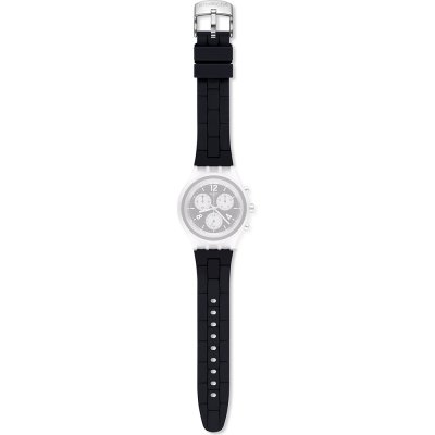 This Swatch watch strap is made of silicone and is attached to the watch by means of steel pins. The band has a width of 19.9 mm and is closed by means of a buckle. The strap has no straight mount which means that this strap is only suitable for the watches listed below.