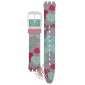This Swatch watch strap is made of silicone and is attached to the watch by means of steel pins. The band has a width of 14.6 mm and is closed by means of a buckle. The strap has no straight mount which means that this strap is only suitable for the watches listed below.