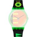 This Swatch watch strap is made of silicone and is attached to the watch by means of steel pins. The band has a width of 19.7 mm and is closed by means of a buckle. The strap has no straight mount which means that this strap is only suitable for the watches listed below.