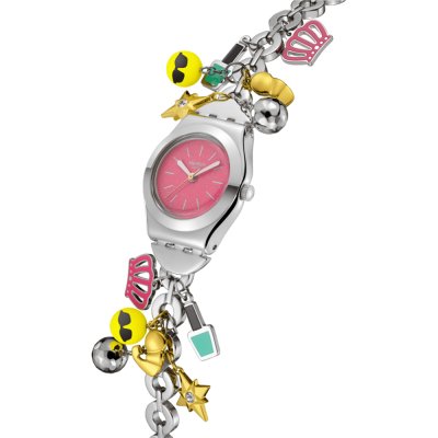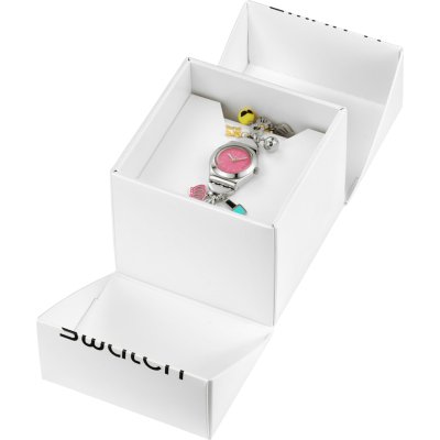 This Swatch watch has a case made of Steel silver with a diameter of 25 mm and is fitted with a Metal strap. Inside the case lies a ETA movement and the watch features a Acrylic crystal.