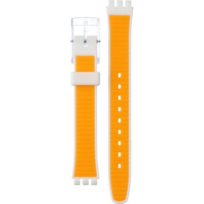 This Swatch watch strap is made of silicone and is attached to the watch by means of steel pins. The band has a width of 12 mm and is closed by means of a buckle. The strap has no straight mount which means that this strap is only suitable for the watches listed below.