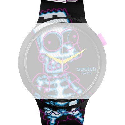 This Swatch watch strap is made of silicone and is attached to the watch by means of steel pins. The band has a width of 19.7 mm and is closed by means of a buckle. The strap has no straight mount which means that this strap is only suitable for the watches listed below.