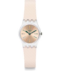 This Swatch watch has a plastic case 25mm in diameter and is fitted with a rubber strap. Inside the case lies a quartz movement and the watch features a plexiglass crystal.