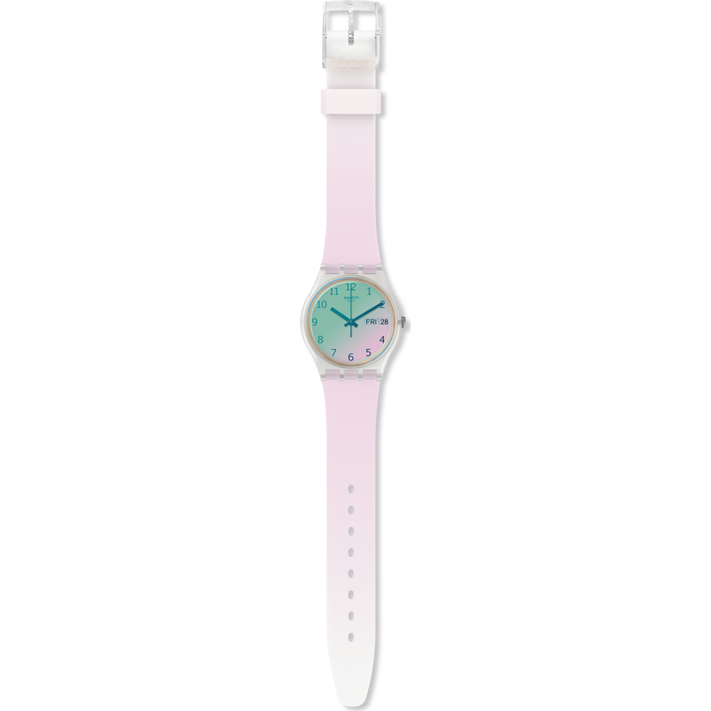 This Swatch watch has a plastic case 34mm in diameter and is fitted with a rubber strap. Inside the case lies a quartz movement and the watch features a plexiglass crystal.