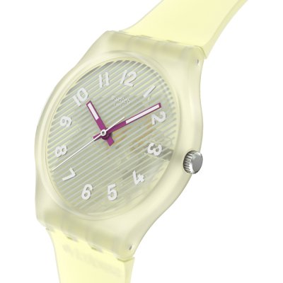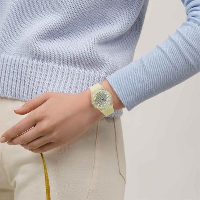 This Swatch watch has a case made of Bio-sourced resin with a diameter of 34 mm and is fitted with a rubber strap. Inside the case lies a ETA movement and the watch features a Acrylic crystal.