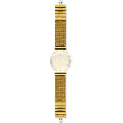 This Swatch watch strap is made of stainless steel and is attached to the watch by means of steel pins. The band has a width of 19.7 mm and is closed by means of a invisible butterfly clasp. The strap has no straight mount which means that this strap is only suitable for the watches listed below.