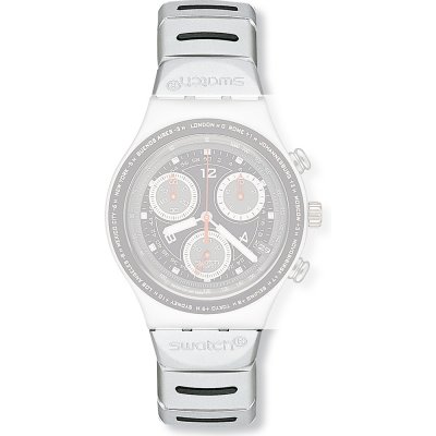 This Swatch watch strap is made of aluminum and is attached to the watch by means of steel pins. The band has a width of 19.7 mm and is closed by means of a deployment Clasp. The strap has no straight mount which means that this strap is only suitable for the watches listed below.