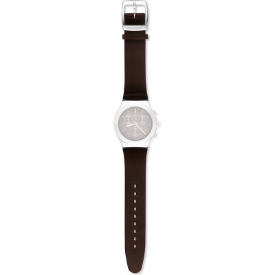 This Swatch watch strap is made of leather and is attached to the watch by means of steel pins. The band has a width of 19.7 mm and is closed by means of a buckle. The strap has no straight mount which means that this strap is only suitable for the watches listed below.