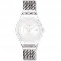This Swatch watch strap is made of stainless steel and is attached to the watch by means of steel pins. The band has a width of 19.6 mm and is closed by means of a invisible butterfly clasp. The strap has no straight mount which means that this strap is only suitable for the watches listed below.