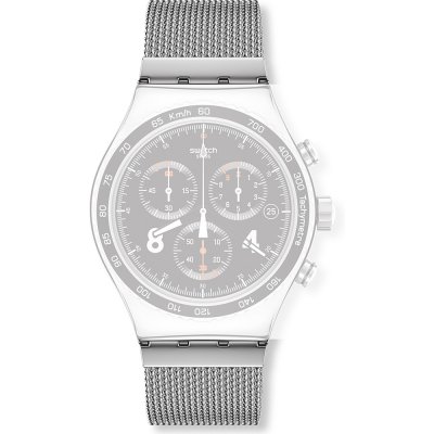 This Swatch watch strap is made of stainless steel and is attached to the watch by means of steel pins. The band has a width of 21 mm and is closed by means of a milanese clasp. The strap has no straight mount which means that this strap is only suitable for the watches listed below.