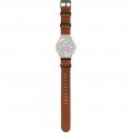 This Swatch watch strap is made of leather and is attached to the watch by means of steel pins. The band has a width of 18.9 mm and is closed by means of a watch strap loops. The strap has no straight mount which means that this strap is only suitable for the watches listed below.