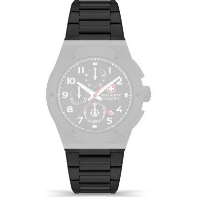 This Swiss Military Hanowa watch strap is made of stainless steel and is attached to the watch by means of steel pins. The band has a width of 27 mm and is closed by means of a deployment clasp with push buttons and safety. The strap has no straight mount which means that this strap is only suitable for the watches listed below.