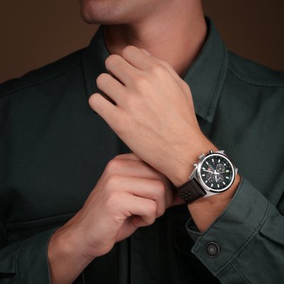 This Swiss Military Hanowa watch has a case made of Steel silver with a diameter of 43 mm and is fitted with a leather strap. Inside the case lies a Ronda movement and the watch features a Sapphire crystal.