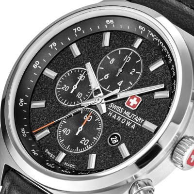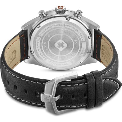 This Swiss Military Hanowa watch has a case made of Steel silver with a diameter of 43 mm and is fitted with a leather strap. Inside the case lies a Ronda movement and the watch features a Sapphire crystal.