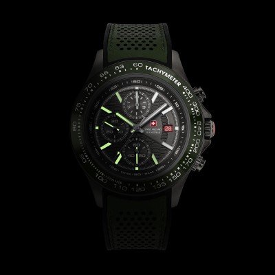 This Swiss Military Hanowa watch has a case made of Steel silver with a diameter of 43 mm and is fitted with a rubber strap. Inside the case lies a Ronda movement and the watch features a Sapphire crystal.