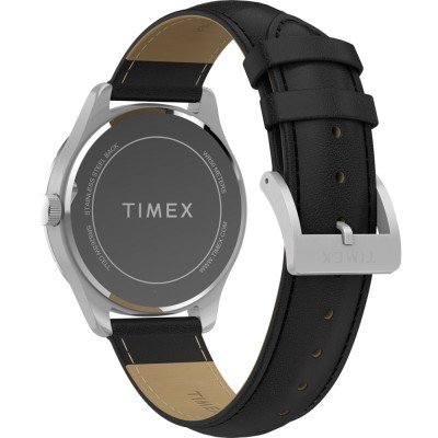 This Timex watch has a case made of metal alloy with a diameter of 42 mm and is fitted with a leather strap. Inside the case lies a Timex movement and the watch features a Mineral crystal.