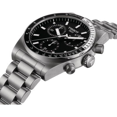The Tissot PR 516 chronograph is a reinterpretation of a popular model from the 1960ies. The collection includes a mechanical chronograph model and three quartz variants. The PR in the name stands for "P articularly R obust" or sometimes also for "P recision and R esistance". 516 means it was the 16th model in the 5th (water resistant) series. The Tissot PR516 collection has a dynamic sporty retro design. The tapered stainless steel case combines robustness and style, with three counters for the timer function, and a tachymeter and heart rate monitor on the bezel to measure speed and heart rate. The placement of the counters is different between the mechanical and quartz models, creating a distinction between the two. The bezel, indexes and hands are coated with Super-LumiNova® for better visibility in all conditions. The case back of the quartz watch features an engraved laurel wreath and a sports car steering wheel with the number 516 in the center, symbolizing the racing heritage that comes with this collection.