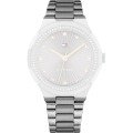 This Tommy Hilfiger watch strap is made of stainless steel and is attached to the watch by means of push pins. The band has a width of 18 mm and is closed by means of a deployment clasp with push buttons. The strap has no straight mount which means that this strap is only suitable for the watches listed below.