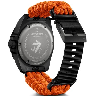 This Victorinox watch has a case made of Titanium with a diameter of 43 mm and is fitted with a Paracord strap. Inside the case lies a Ronda movement and the watch features a Single anti-reflective sapphire crystal.
