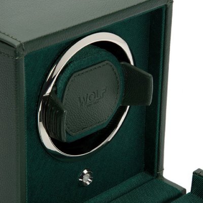 This green Cub watchwinder by Wolf is sleek, has a timeless design but is still a bit different because of the colour. Perfect if you're looking for an eye catcher! The watchwinder has a single winding module, chrome-plated hardware, works on both batteries and electricity and is made of vegan leather. An additional advantage is the cover, which protects your automatic watch from dirt and damage.