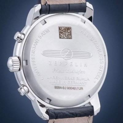 This Zeppelin watch has a case made of Steel silver with a diameter of 40 mm and is fitted with a leather strap. Inside the case lies a Ronda movement and the watch features a K1 Mineral crystal.