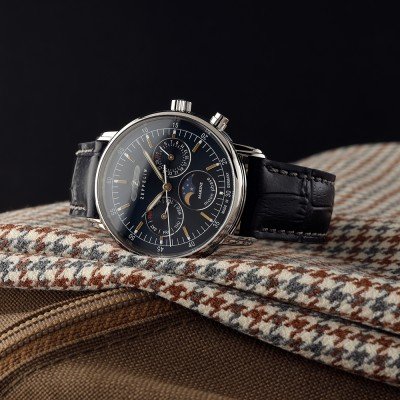 This Zeppelin watch has a case made of Steel silver with a diameter of 36 mm and is fitted with a leather strap. Inside the case lies a Ronda movement and the watch features a K1 Mineral crystal.
